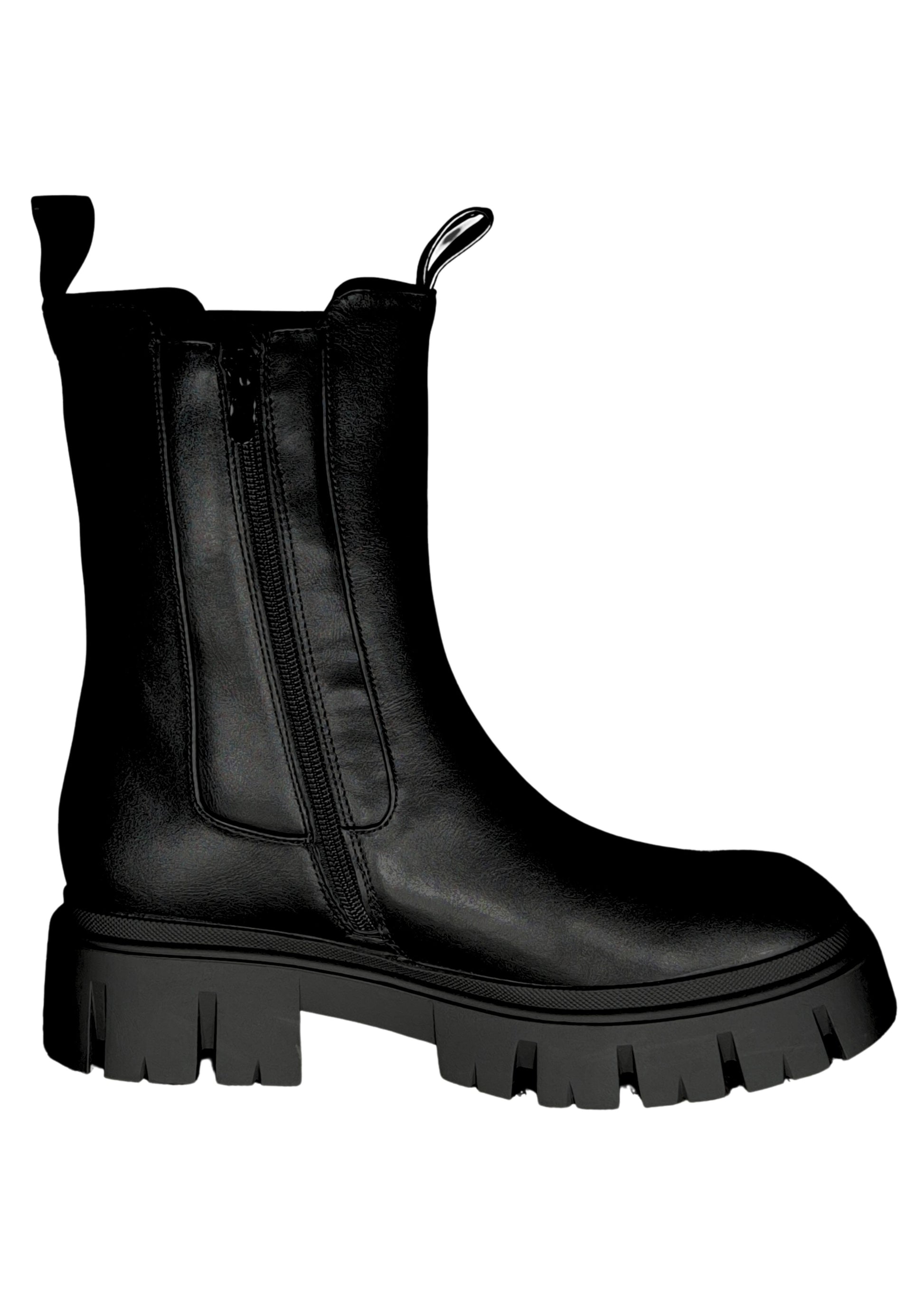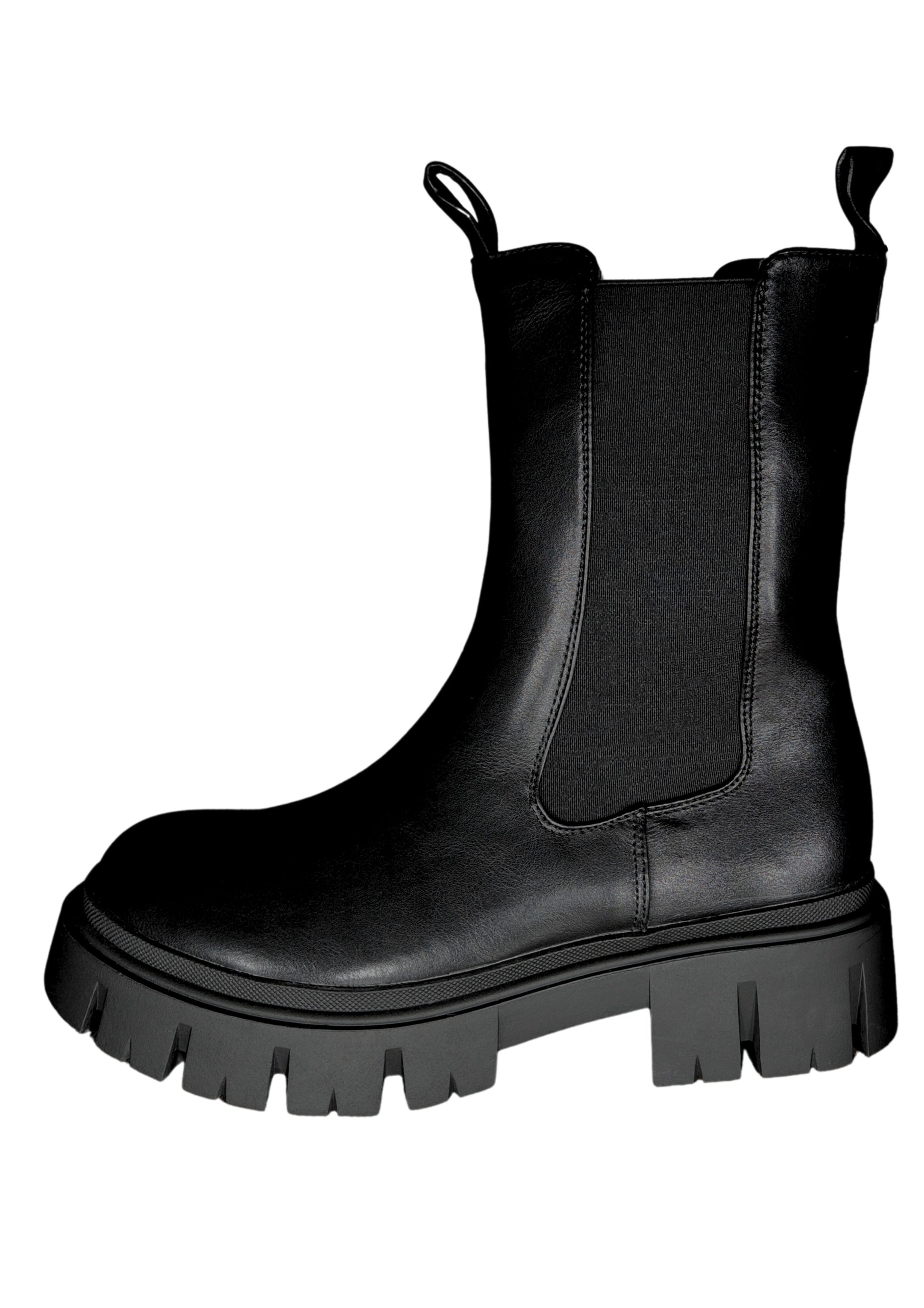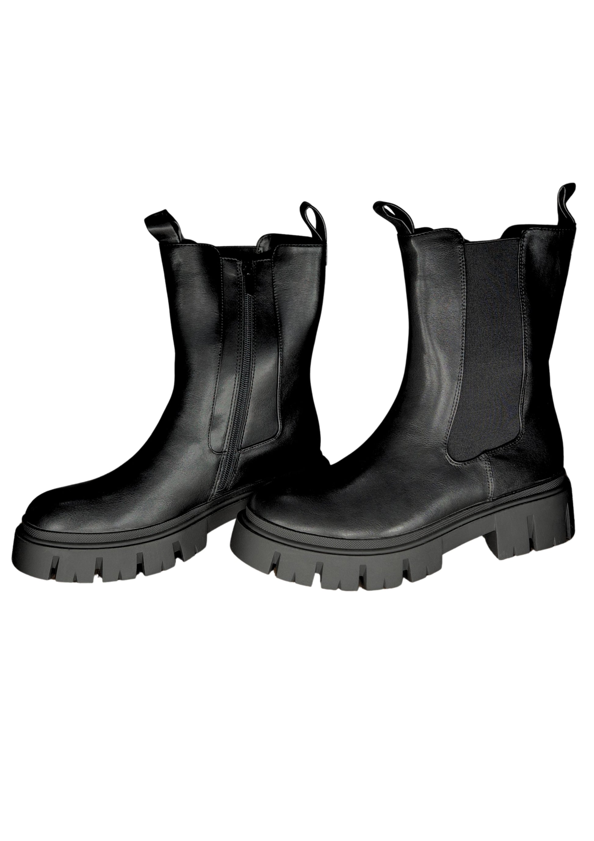 Cholewka o fasonie wysokich sztybletów, sięgająca za kostkę, wykonana jest z gładkiej, wysokiej jakości imitacji skóry w kolorze głębokiej czerni.